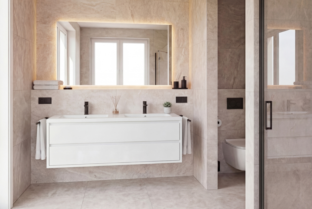 Großzügige, bodentiefe Holz-Alu-Fenster lassen viel Tageslicht in die Räume und schaffen fließende Übergänge zu den Außenbereichen. Elektrische Rollläden bieten zusätzlichen Komfort und Sicherheit. Die hochwertig ausgestatteten Design-Bäder unterstreichen den exklusiven Anspruch dieser Villa. Modernste Haustechnik garantiert zukunftsorientiertes und nachhaltiges Wohnen.