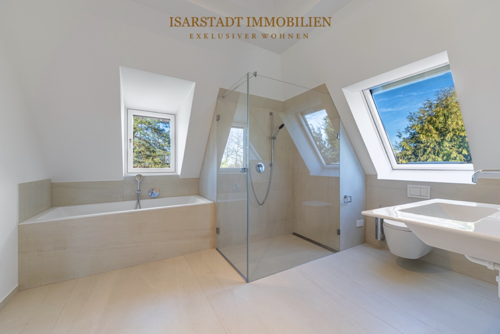 Die luxuriösen Bäder bieten ein Spa-Gefühl im eigenen Zuhause. Große Designer-Fliesen, Rainshower-Duschen und Duravit- Keramikimplikationen ergänzen die Ausstattung, ergänzt durch maßgefertigte Quarzstein-Waschbecken sowie eine großzügige Walk-In-Dusche und eine Designer-Badewanne im Masterbad. Familienfreundlichkeit wird hier großgeschrieben: Drei Kinderzimmer plus eigenes Kinderbad im Dachgeschoss, sowie ein großzügiger Masterbereich mit Ankleide, Bad und Süd- Balkon im 1. OG Ein Souterrain mit Gäste-, Fitness- und Kinobereich rundet das Raumangebot ab.