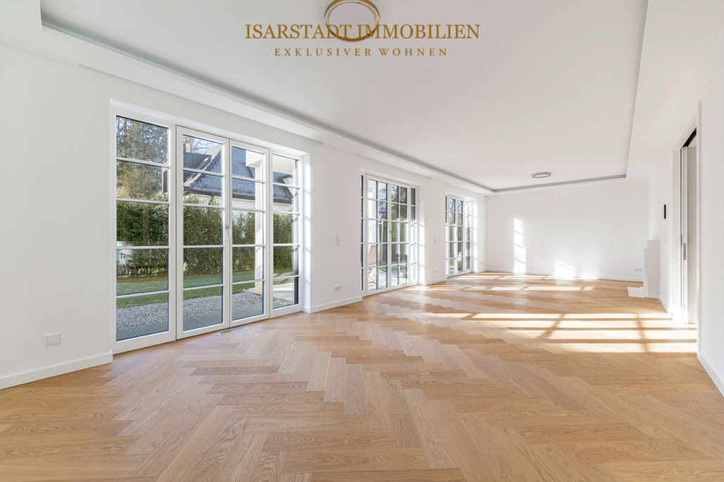 Die exklusive Villa in Grünwald präsentiert sich mit klassischrepräsentativer Architektur. Die Villa verfügt über einem großzügigen Wohn- und Essbereich sowie einer hochwertig ausgestatteten Einbauküche. Große Fensterfronten und offene Raumstrukturen schaffen eine helle, lichtdurchflutete Atmosphäre und verbinden Wohn- mit Essbereich zu einer einladenden Mittelpunktzone des Hauses.