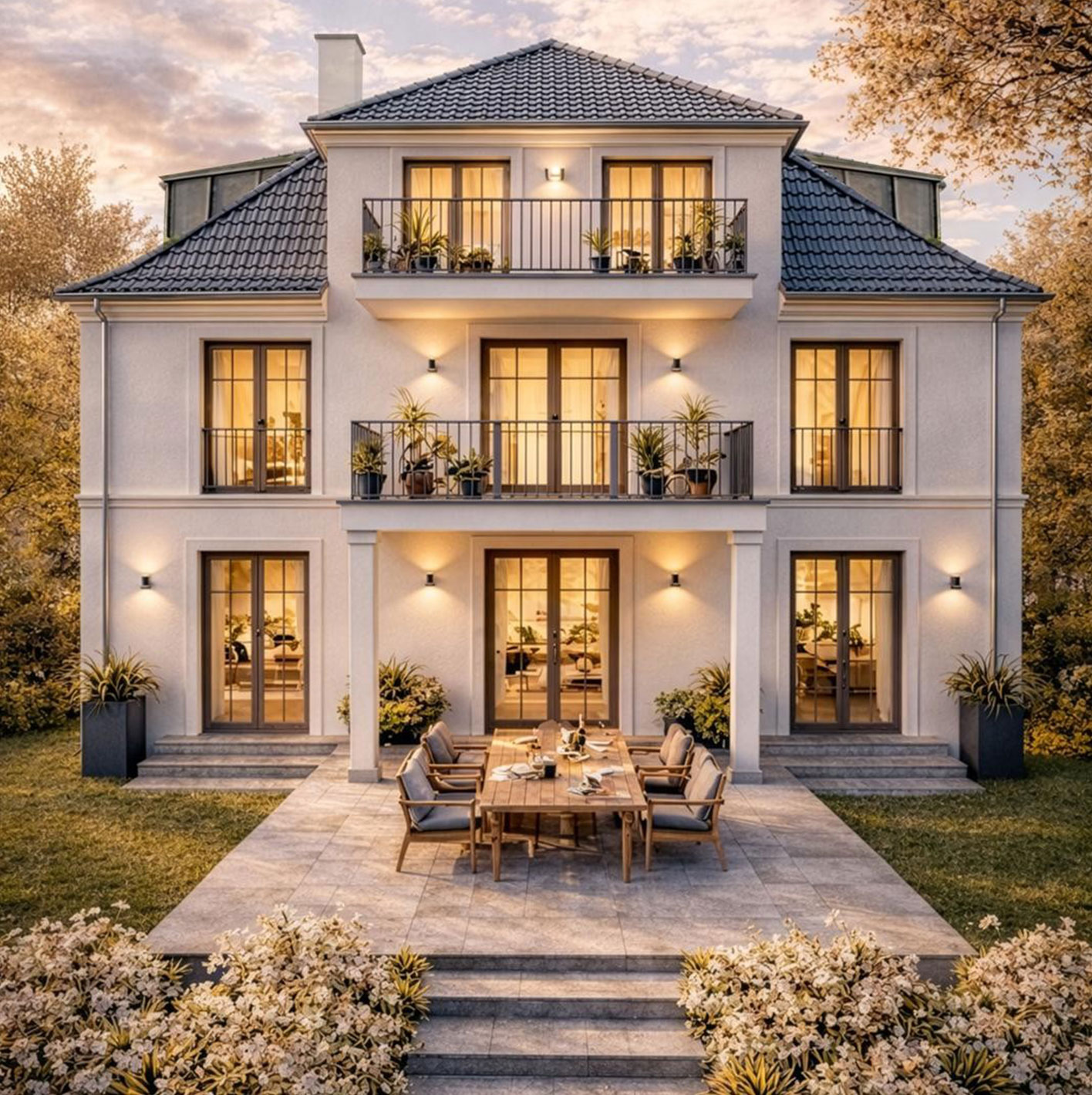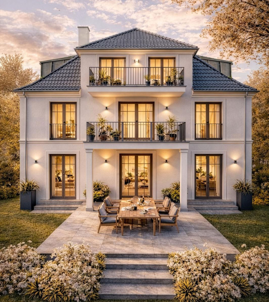 Ein intelligentes KNX-BUS-System ermöglicht die komfortable Steuerung von Licht, Heizung, Beschattung und weiteren Funktionen, während eine Alarmanlage für ein hohes Maß an Sicherheit sorgt. Der Außenbereich ist ein echtes Highlight: Eine großzügige Terrasse und ein Balkon laden zum Entspannen und Genießen ein – perfekt als private Rückzugsorte oder für repräsentative Anlässe.